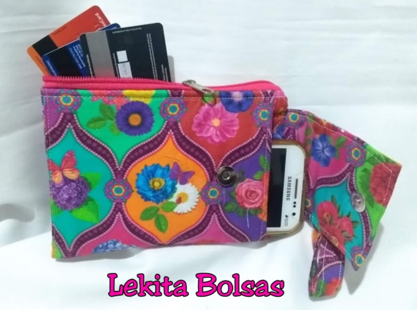 Porta celular com carteirinha para dinheiro e cartões, revestida em tecido, estruturada com manta R1.