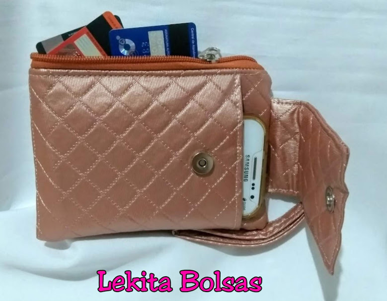 Porta celular com carteirinha para dinheiro e cartões, revestida em tecido, estruturada com manta R1.