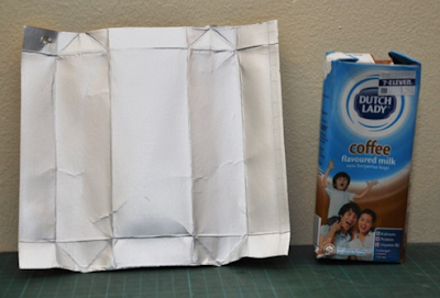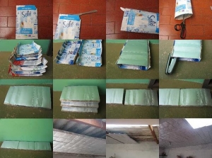 O primeiro passo é abrir totalmente as caixinhas, descolando as emendas e fazendo um corte vertical para que a embalagem fique completamente plana. Em seguida, é feita a limpeza com água, sabão em pó e um pouco de desinfetante. Depois de secas, as embalagens devem ser coladas lado a lado, com cola branca ou de sapateiro, formando uma manta sobre a laje superior da casa, abaixo do telhado.