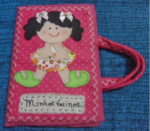 No Caderno de Vacinas foi feita uma capa com feltro e com detalhes de uma linda menina.