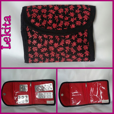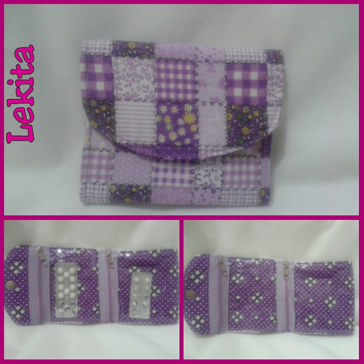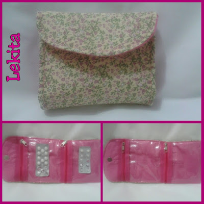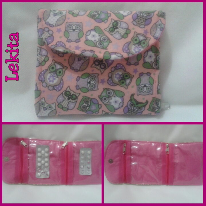 Necessarie para organizar remédios, revestida com tecido de algodão, manta estruturada, com 2 envelopes de plástico com zíper. Peça fechada com botão de pressão.