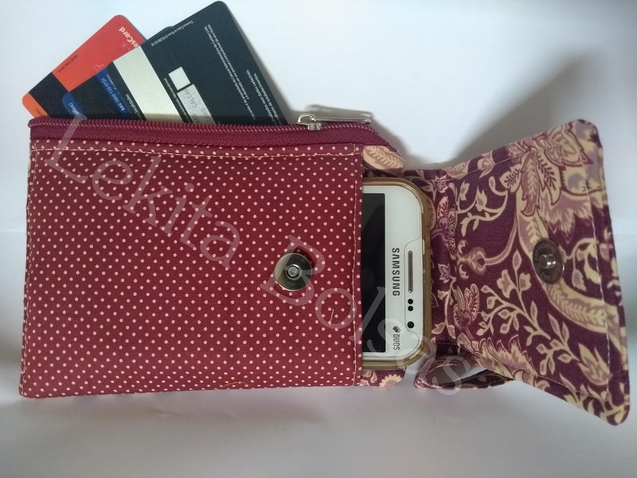 Porta celular com carteirinha para dinheiro e cartões, revestida em tecido, estruturada com manta R1.