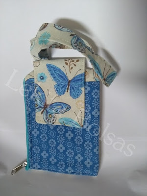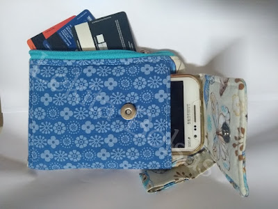 Porta celular com carteirinha para dinheiro e cartões, revestida em tecido, estruturada com manta R1.