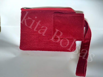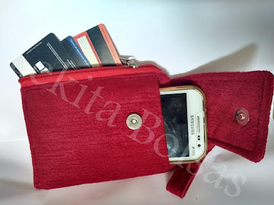 Porta celular com carteirinha para dinheiro e cartões, revestida em tecido, estruturada com manta R1.